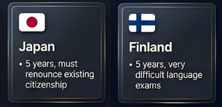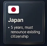 - 日本:居住5年、既存国籍の放棄が必要