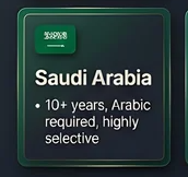 - サウジアラビア:居住10年以上、アラビア語必須、非常に選別的
