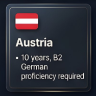 - オーストリア:居住10年、ドイツ語能力(B2レベル)必須