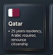 - カタール:居住25年、アラビア語必須、国籍放棄が必要