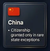 - 中国:国籍付与は極めて例外的、国家の特別判断のみ