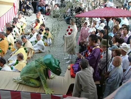 巨大なカエルに扮した男が石段を飛び跳ね、僧侶の読経によって人間の姿に戻るっていう儀式がある。