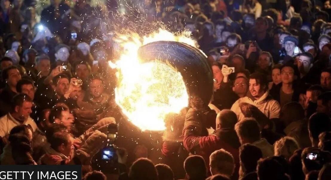 *イギリス・デヴォン州の祭りで、火をつけたタール樽を担いで走る行事のこと。