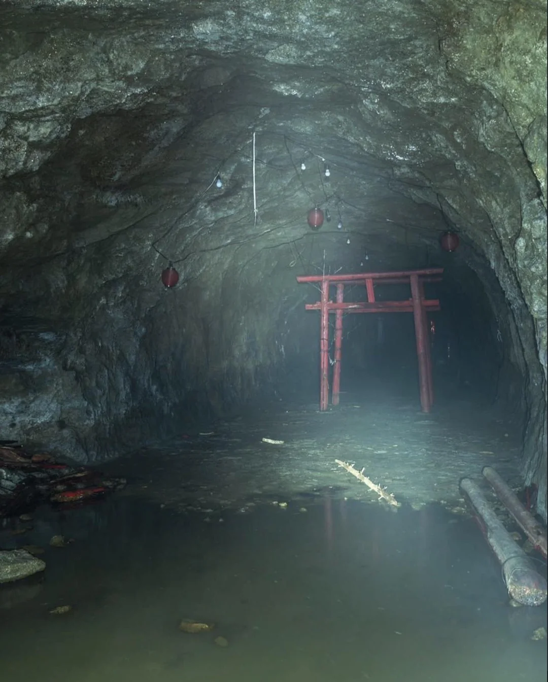 日本の水没したトンネルの先で見つかった放棄された鳥居。