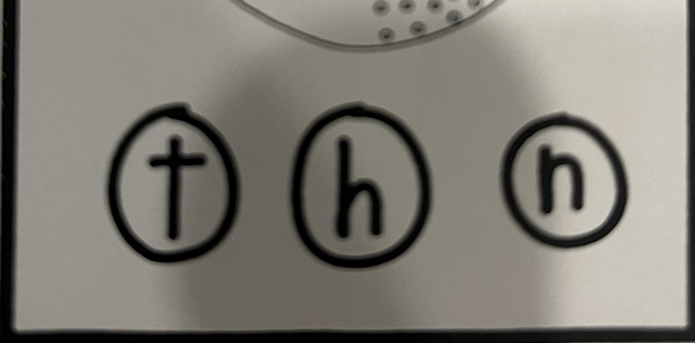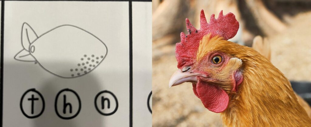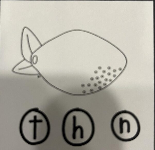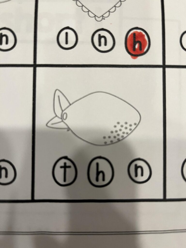 例えば上の例はハートに見える絵で、子どもは単語 “heart” の最初の文字 “h” を塗ったってこと。