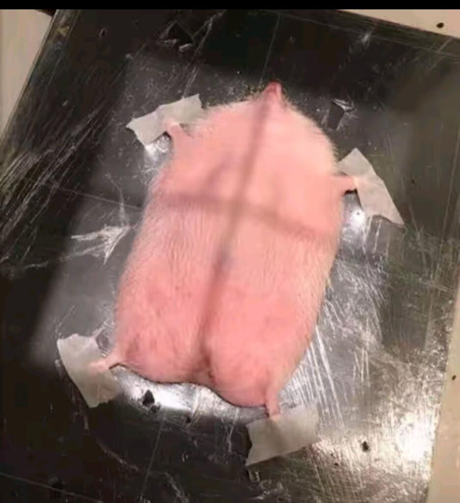 たぶん麻酔で眠らせて、体勢を保つためにテープで軽く固定してるんだと思うよ。