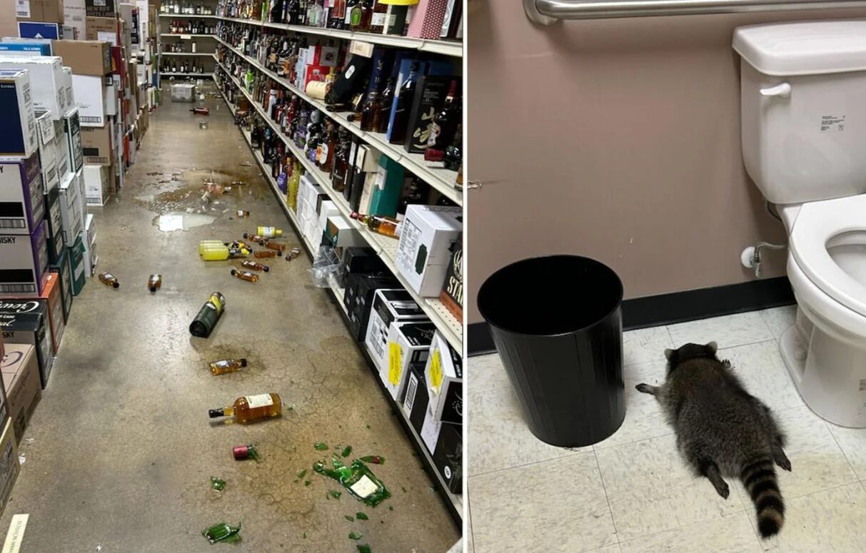 酒屋に侵入して酔っ払ったアライグマ。