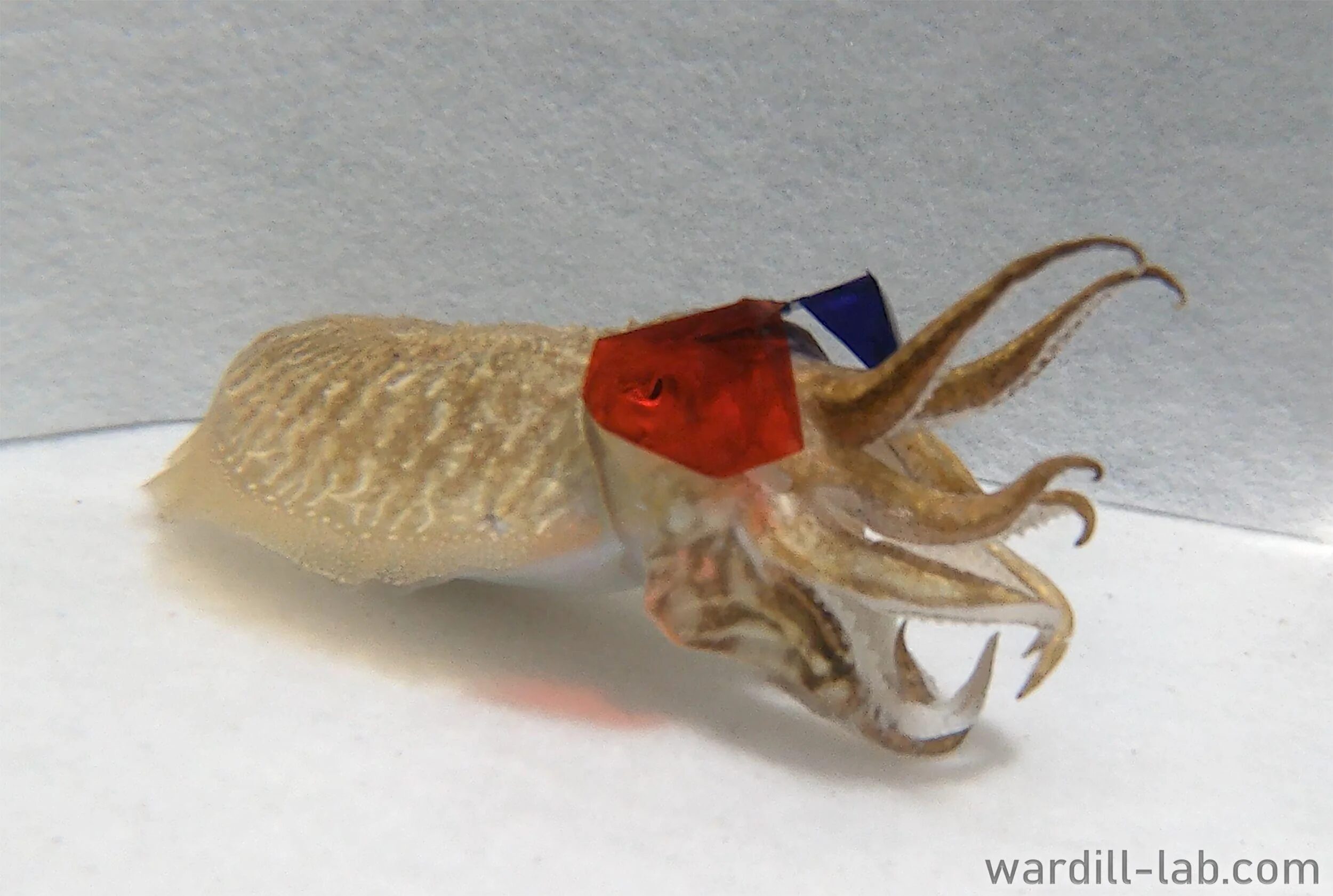 コウイカに3Dメガネを装着させて、エビの3D動画を見せて反応を調べている様子。