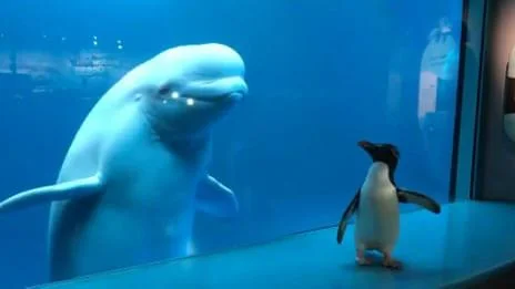 自由に歩き回れる水族館でシロイルカと出会ったペンギン。