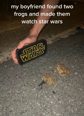 スターウォーズを見せられてるカエル。